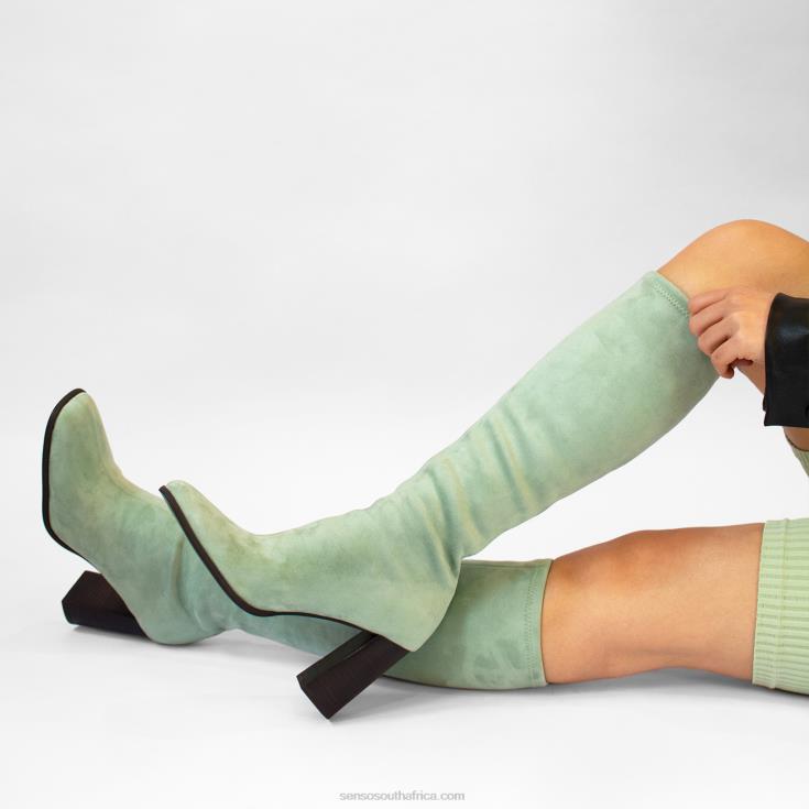 Mint stretch faux suede knee-high boot, featuring a block high heel and side zip fastening.
