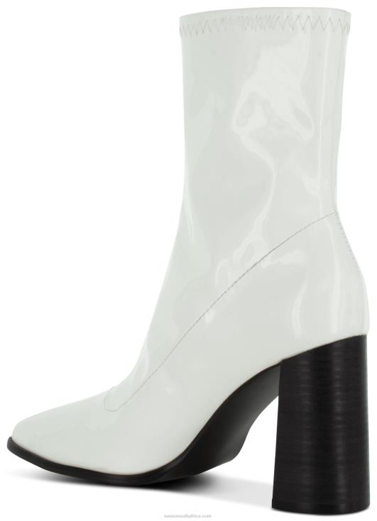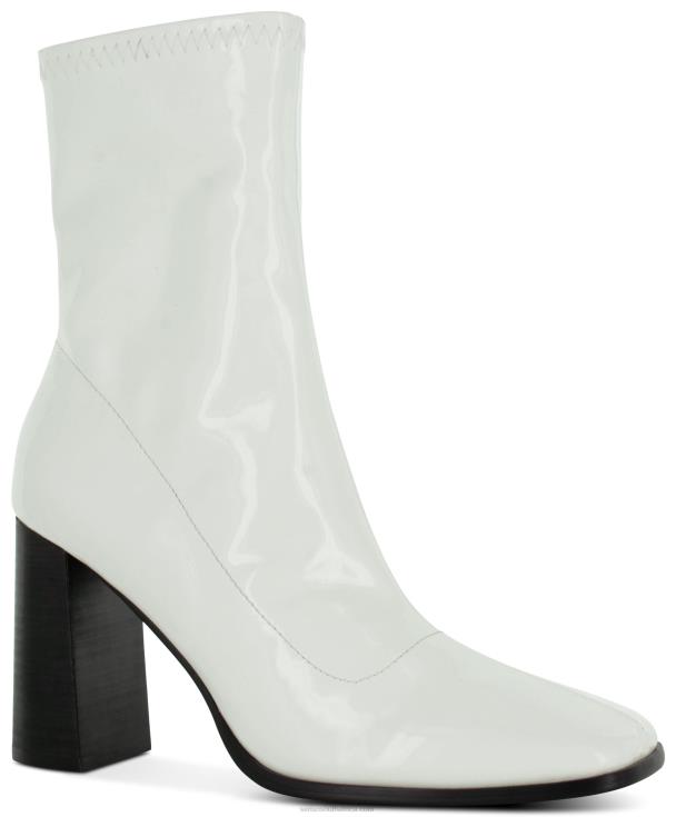 Ice stretch patent ankle boot, featuring a block heel, squared toe and concealed zip on inseam.