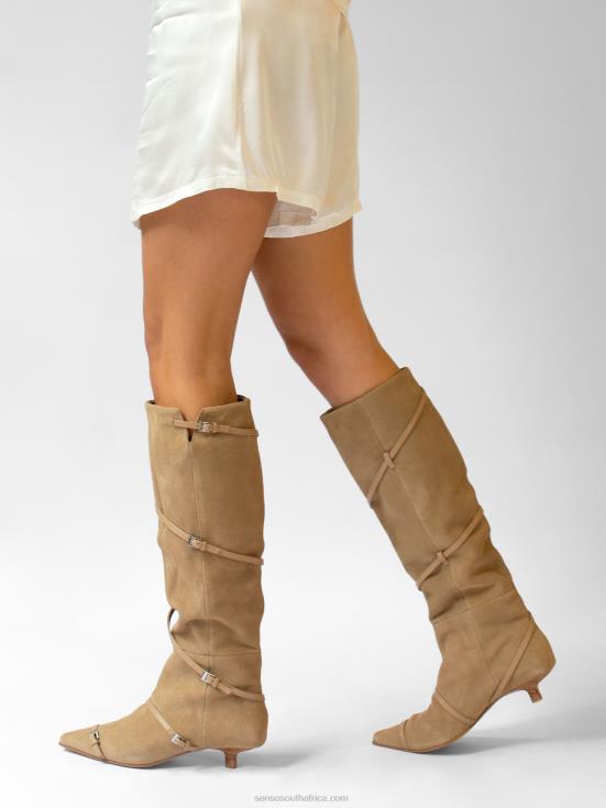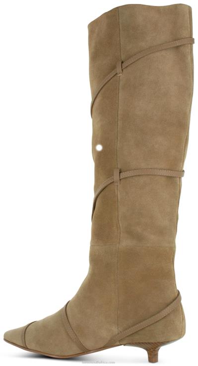 Almond calf suede knee high boots, featuring a kitten heel and buckle detailing.