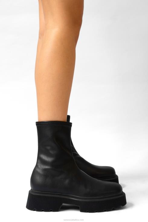 Ebony vegan stretch leather boots, featuring a rubber tractor sole, nylon zip and square toe.
