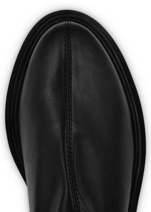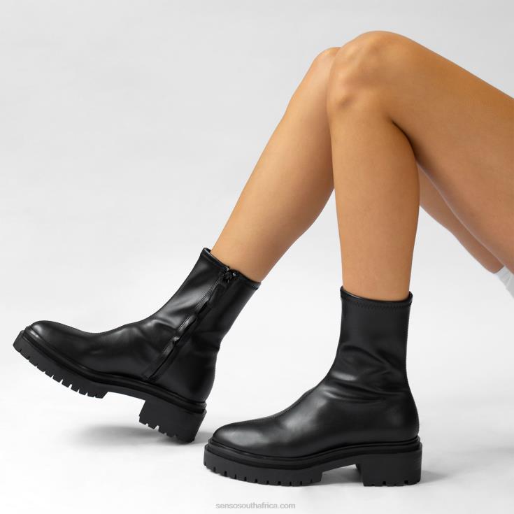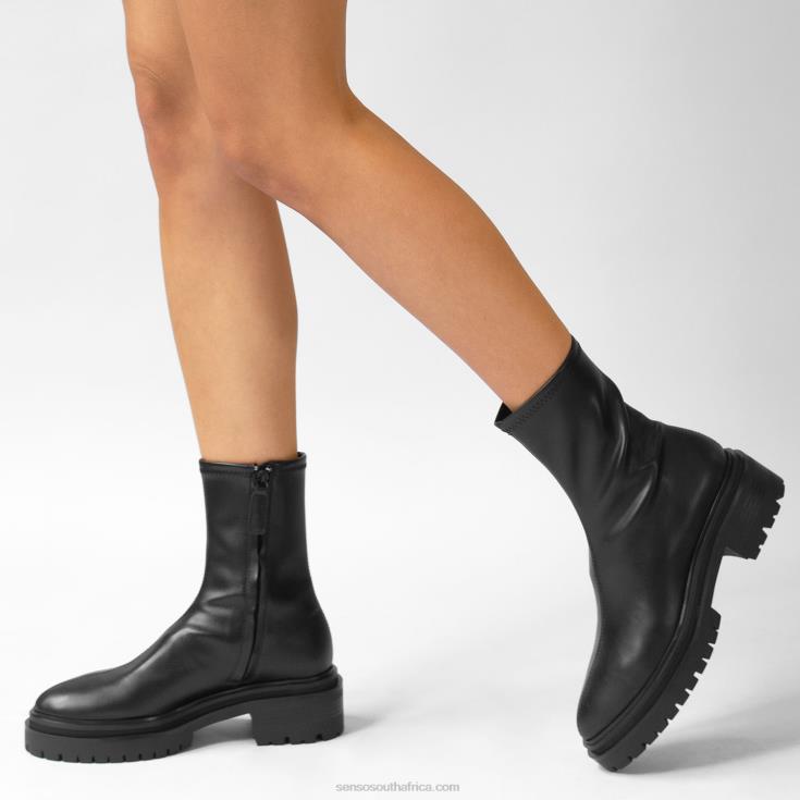 Ebony PU stretch nappa ankle boot, featuring a low heel, nylon zipper and rubber tractor sole.