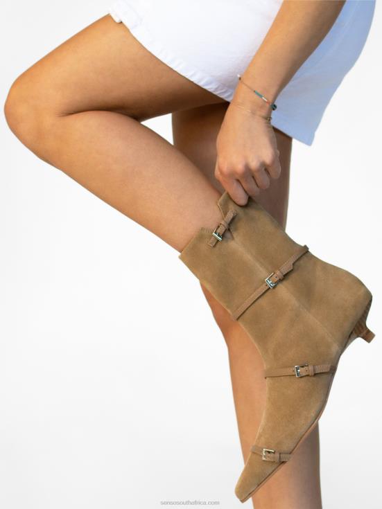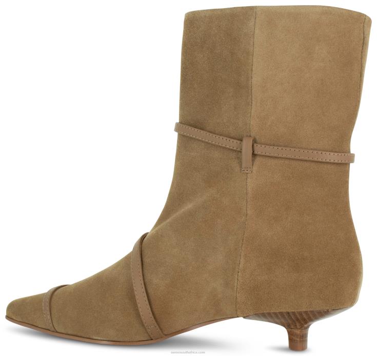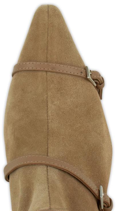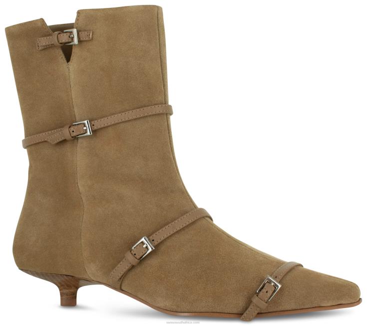 Almond calf suede boot, featuring a kitten heel and buckle detailing.