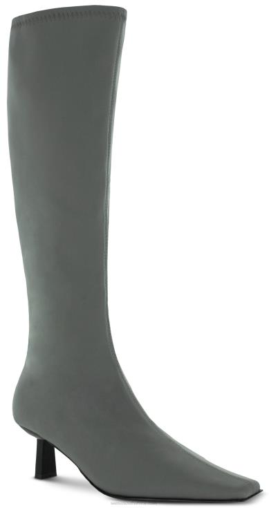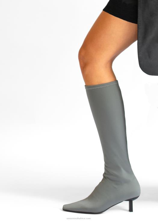 Graphite stretch fabric knee high boots, featuring a stiletto heel, sock-like appearance and a pointed shaped toe.