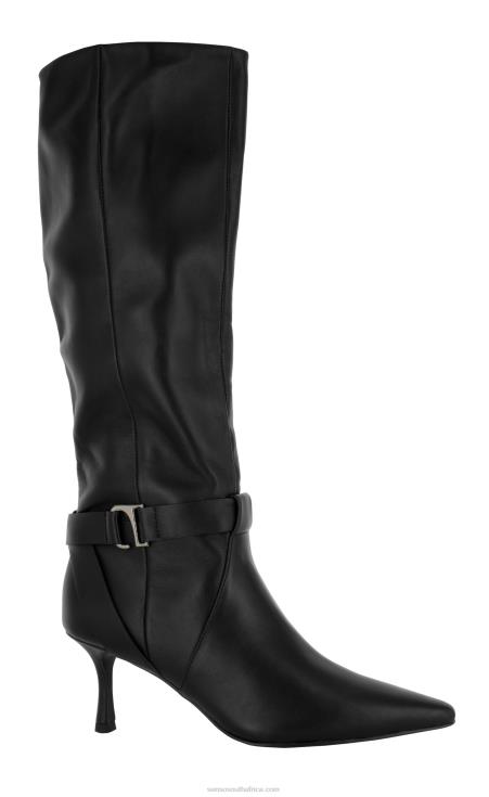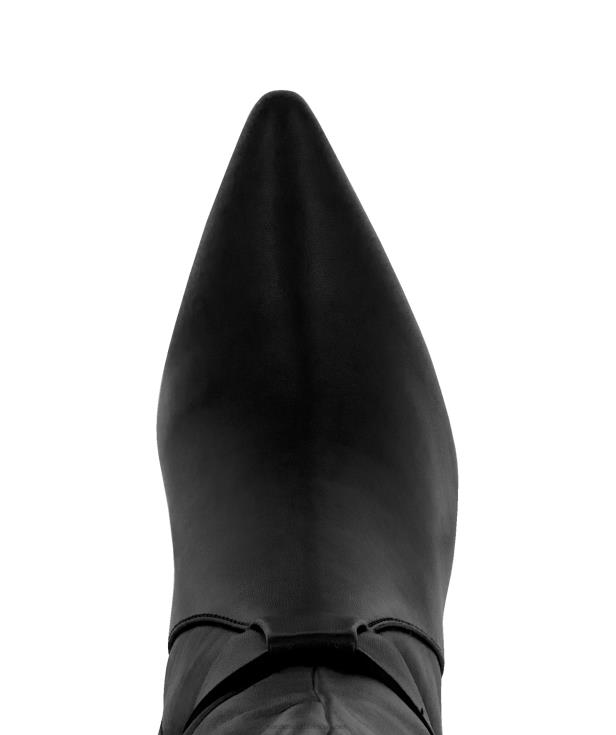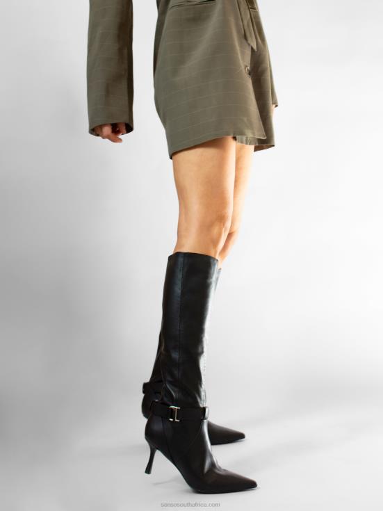 Ebony calf leather knee high boots, featuring a silver clasp detailing, stiletto heel and pointed toe.