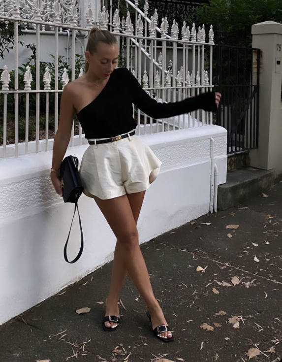Ebony matte kid leather sandals featuring a shiny metal buckle, subtle kitten heel and a square shaped toe.