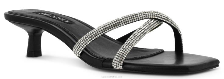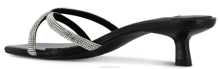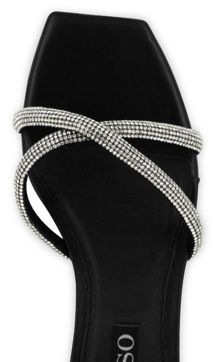Ebony matte kid sparkly mules featuring a crossover crystal embellished strap design, subtle kitten heel and square shaped toe.