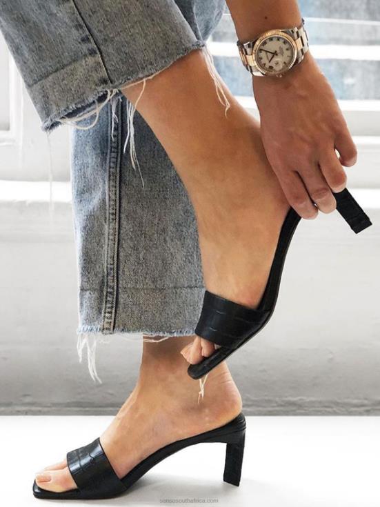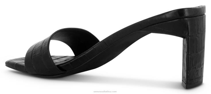 Ebony leather Maisy I mules featuring an open toe, a slip-on style, an embossed crocodile effect, a branded insole and a high heel.