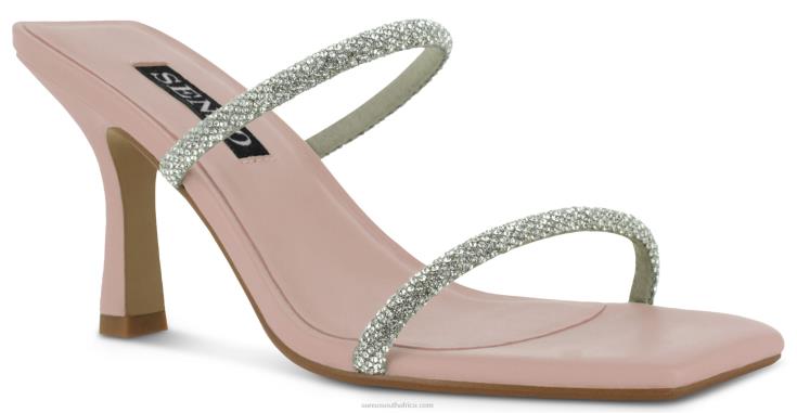 Blush matte kid leather heels featuring a featuring a square open toe and silver crystal straps.