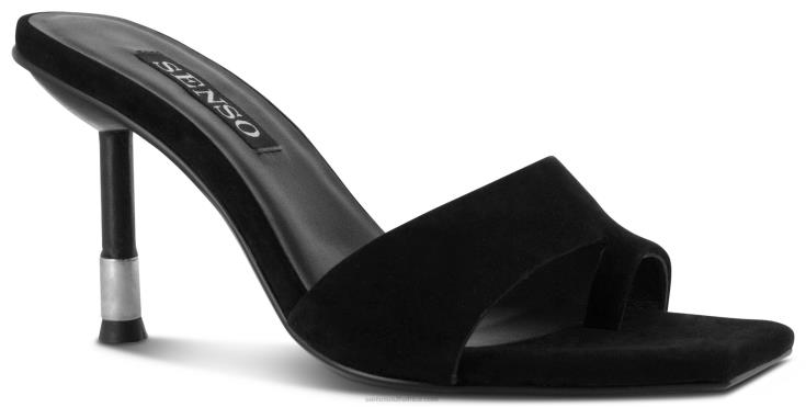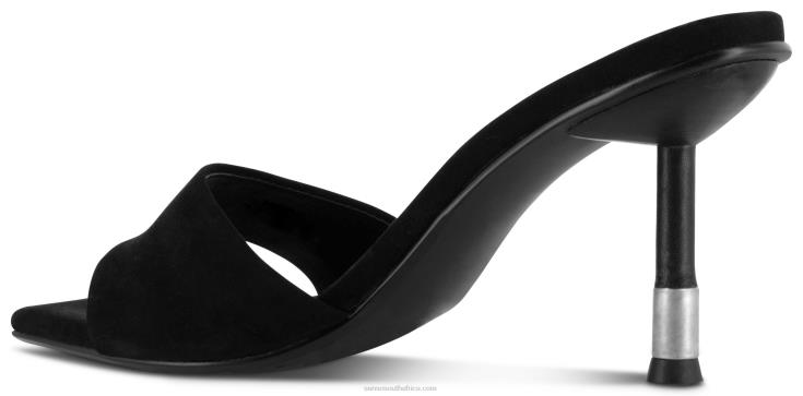 Ebony kid suede heel, featuring an open toe design, metal trim heel and a resin sole.