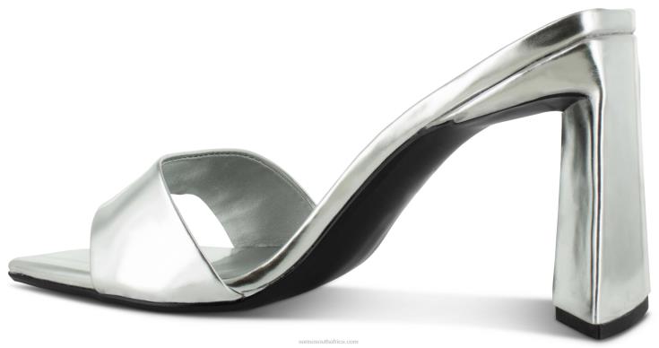Silver chrome heel, featuring a pyramid heel, open toe and a synthetic sole.