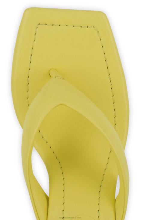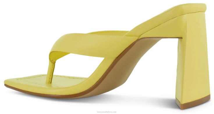 Citrine matte kid leather heels featuring a slip-on design, thong strap detail and a triangular block heel.