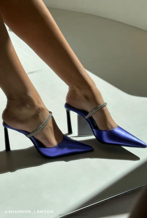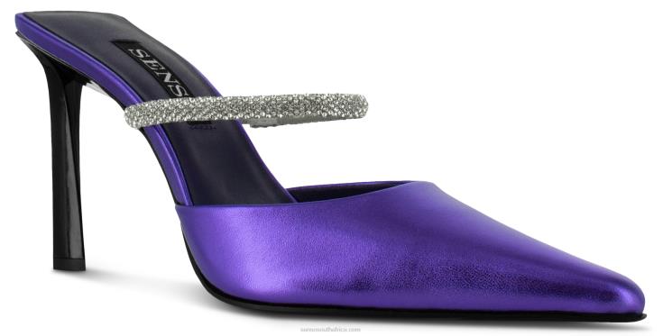 Grape metallic kid leather heels featuring a ballet silhouette with a pointed toe and a thin silver crystal strap.
