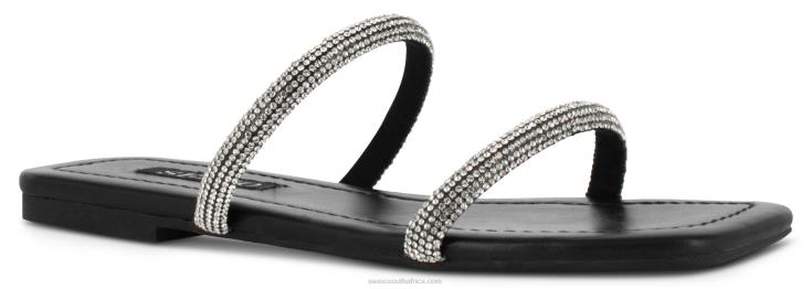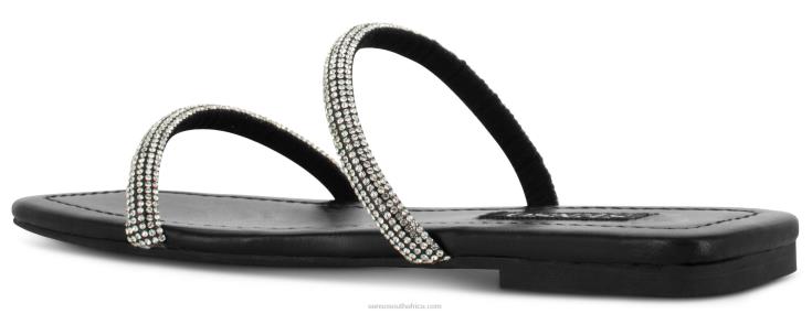 Ebony crystal strap trim sandals featuring a square toe, flat heel and insole stitching.