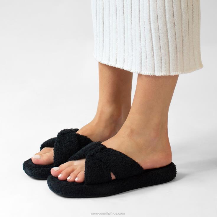 Ebony towelling slides featuring criss-cross straps with a soft cushioned inner and rubber sole.