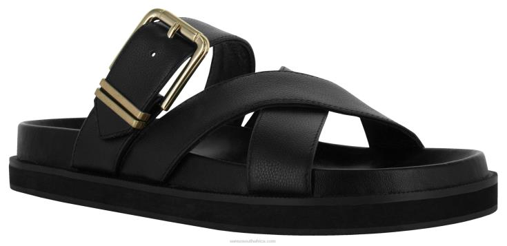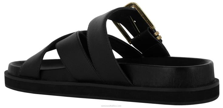 Ebony soft calf sandals, featuring a gold metal buckle, cross over straps and a rubber sole.