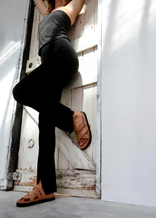 Butterscotch grained calf sandals, featuring a gold metal buckle, cross over straps and a rubber sole.