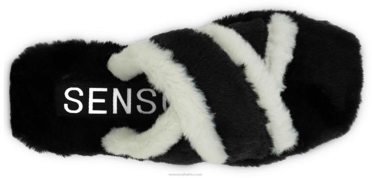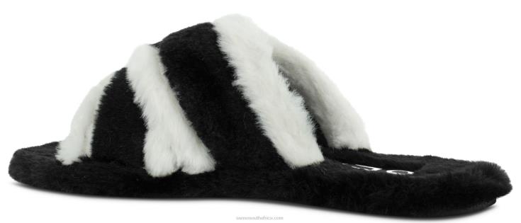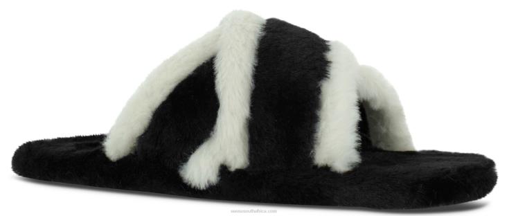 Ebony faux shearling slippers, featuring a fluffy slip-on design, criss-cross straps and a light rubber sole.