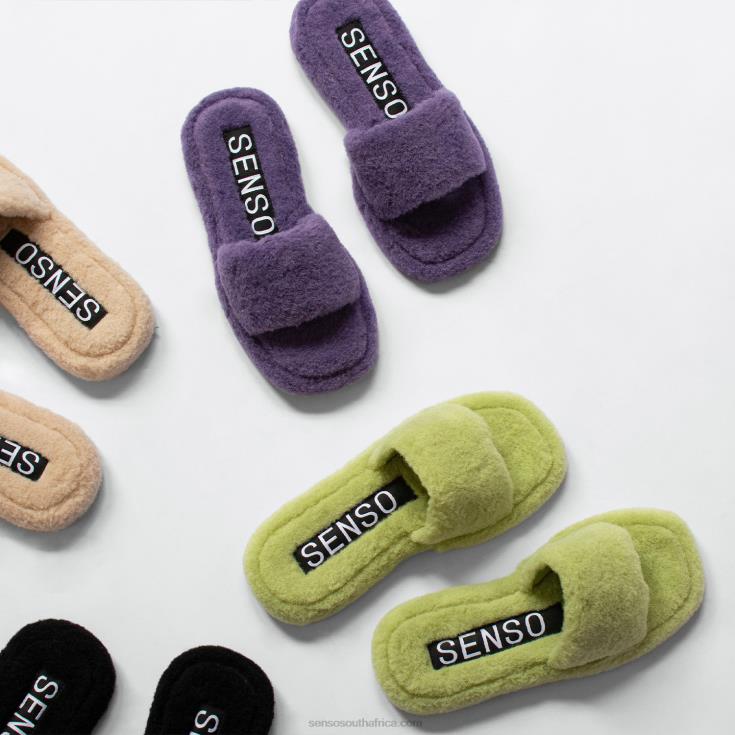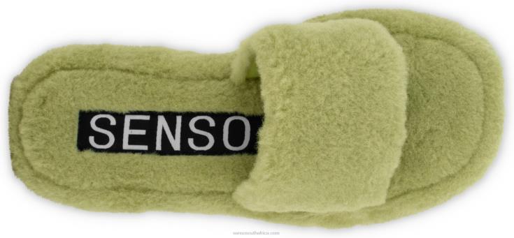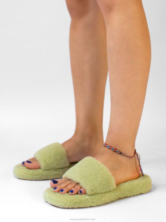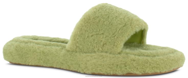 Pistachio faux shearling sandal, featuring a fluffy slip-on design and light rubber soles.