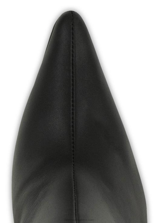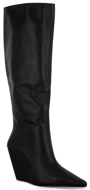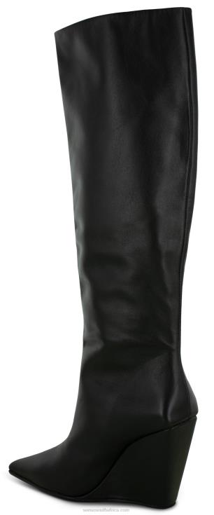 Ebony matte calf knee-high boots, featuring a wedge heel, pointed toe and rubber sole.