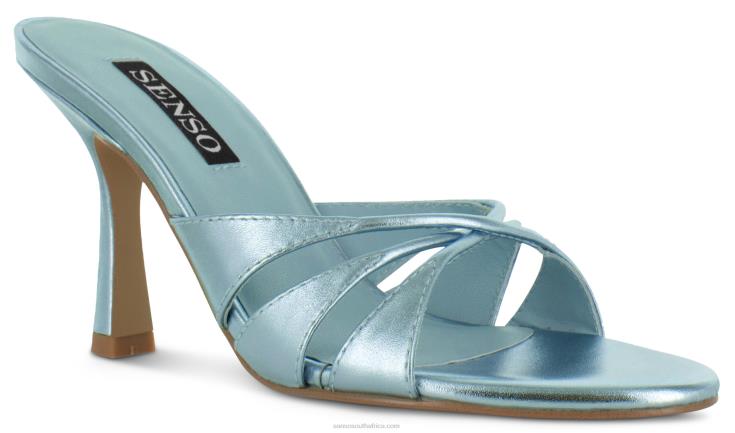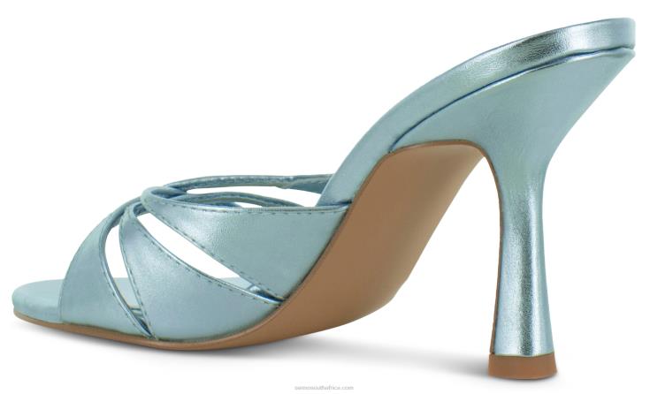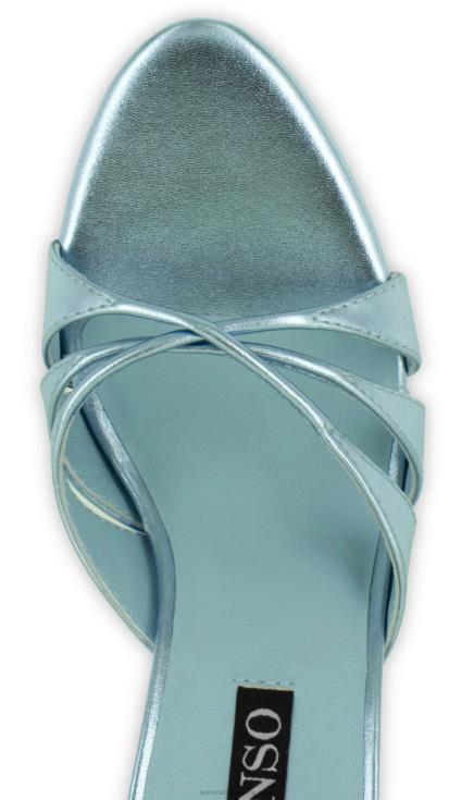 Sky metallic kid leather heeled sandals featuring a crossover triple strap, metallic sheen and almond- shaped toe.